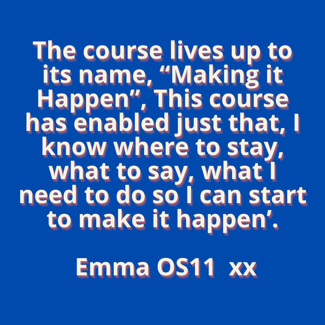 By the end of the course, you will have your own MAKING IT HAPPEN plan, designed by you for what you want to do and how you want to do it.