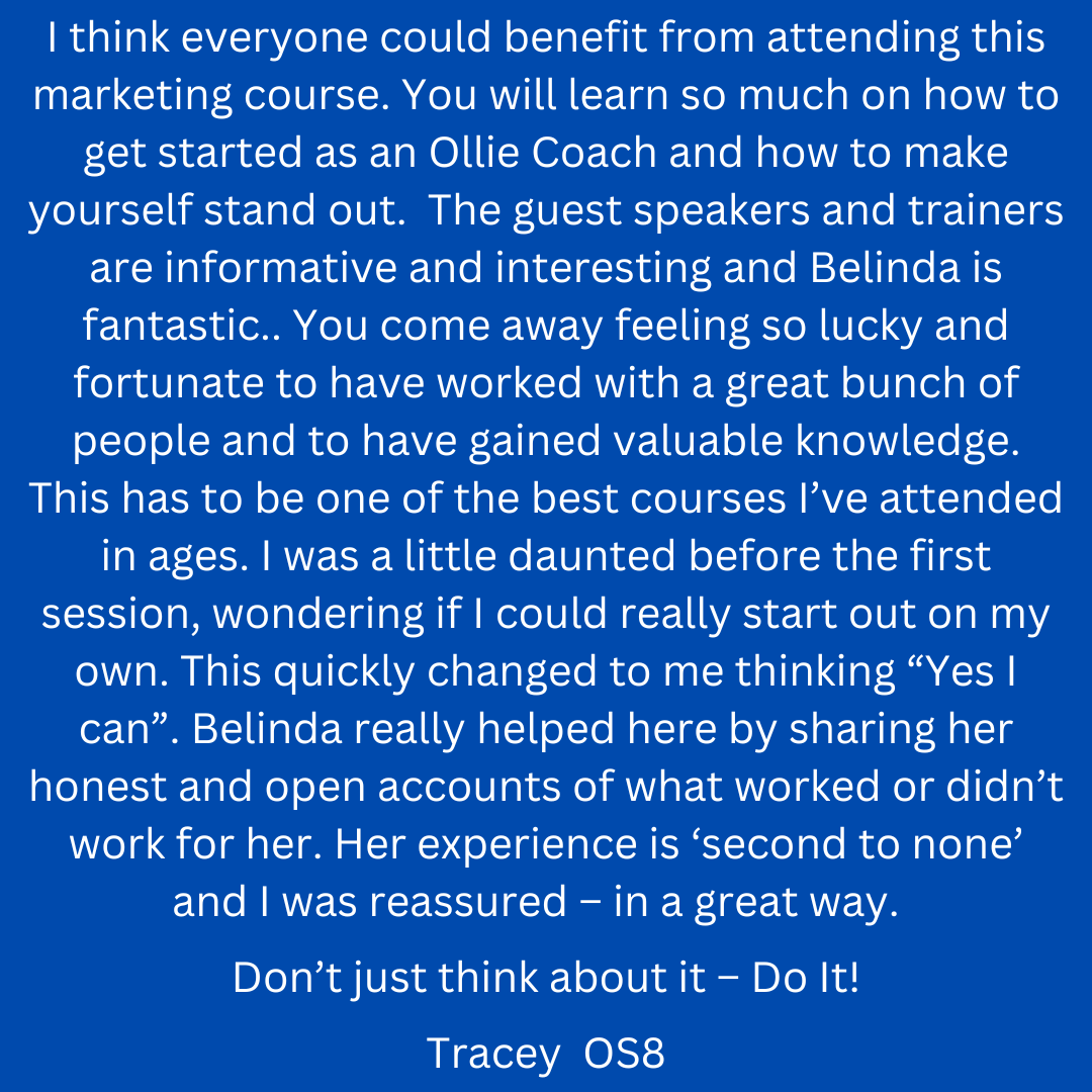 Belinda has pulled all her resources from now and in her past roles to create a really hands on course which will help you to set yourself up as an Ollie Coach working privately as an emotional therapist.  Belinda has also pulled on the expertise of Tally, our marketing guru to help you create graphics and make the most of social media.