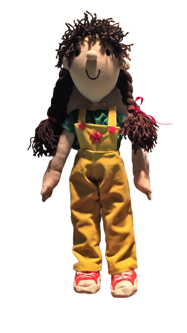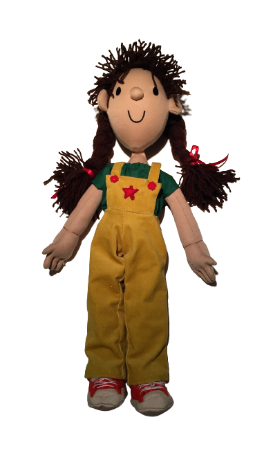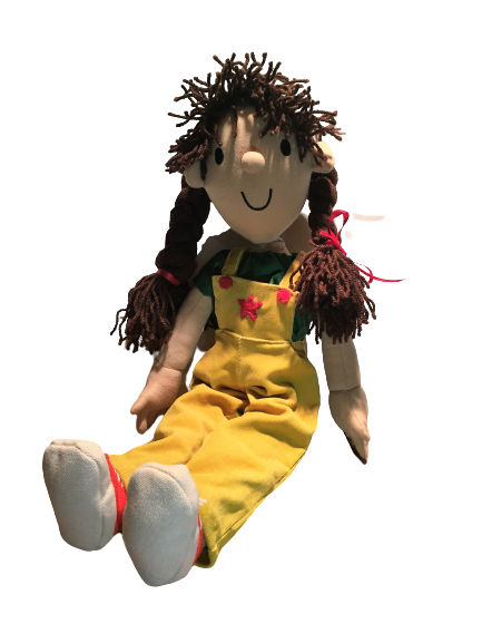 Standing at 53cm from head to toe, not including her plaited brown hair, with embroidered eyes, mouth and cute plush nose, wearing yellow dungarees and a green shirt with red and white trainers. Mollie is easy to hand wash.
