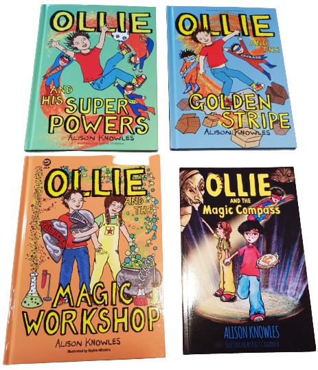 Ollie and his Super Powers and Ollie and the Golden Stripe are paperback. Ollie and the Magic Compass is hardback. All with dimensions of approximately 25cm by 17cm.